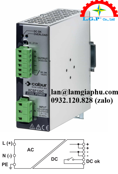 Cabur XCSF120C là bộ nguồn xung (switching power supply) một pha thuộc dòng Cool Power của hãng Cabur (Ý), được thiết kế để gắn trên thanh DIN Rail trong các hệ thống tự động hóa công nghiệp. Thiết bị này cung cấp đầu ra ổn định 24V DC / 5A với tổng công suất 120W.