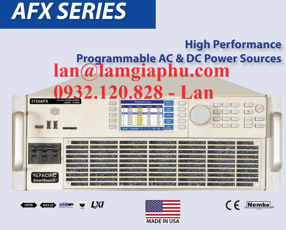 – Dòng AFX có hiệu quả về mặt chi phí và có thể lập trình đầy đủ cho cả các ứng dụng chuyển đổi tần số cơ bản và đường dây nguồn AC hoặc thử nghiệm nhiễu loạn nguồn DC tiên tiến.