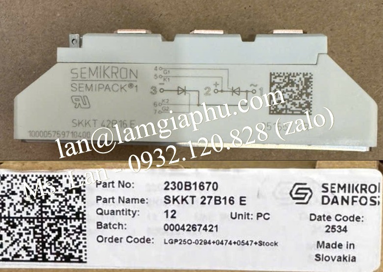 SEMIKRON SKKT 42B16E là một mô-đun thyristor kép (SCR) được thiết kế cho các ứng dụng công nghiệp, với định mức dòng điện là 40A và điện áp lặp lại tối đa là 1600V.